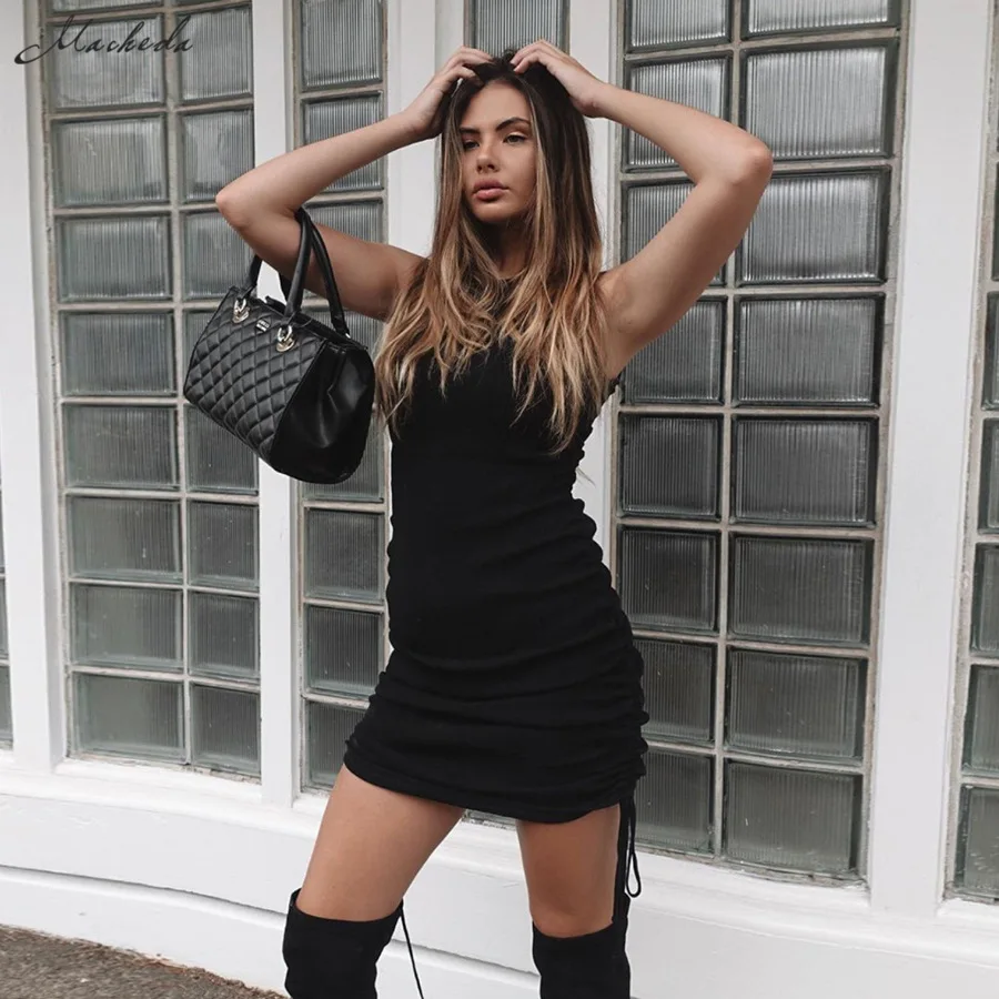 Best Price Comparison With Macheda Summer Solid Casual Vacation Slim Dress Women knitting O Neck Sleeveless Fashion Skinny Lady Mini Wrap Dress 2020 New