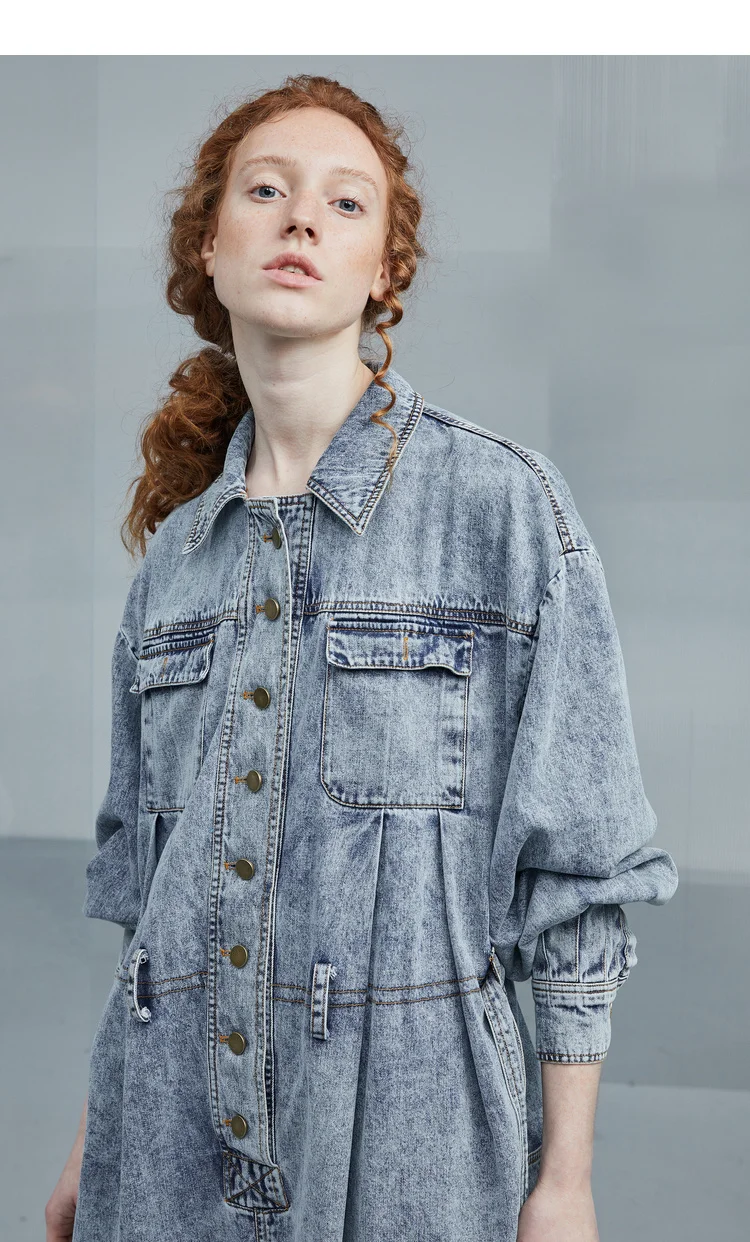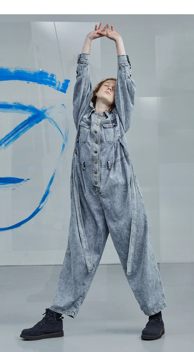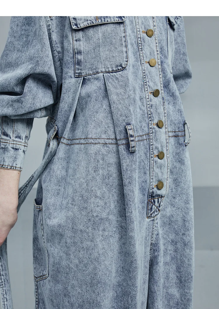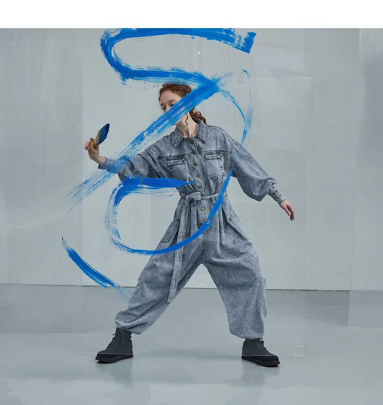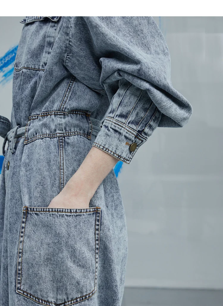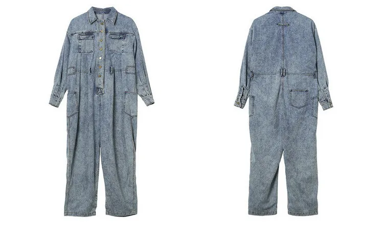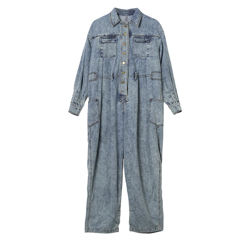 Free Shipping Original Design AIGYPTOS Spring Summer Women Brief Handsome Vintage Denim Jumpsuit Casual Loose Long Sleeve Cotton Denim Overalls.