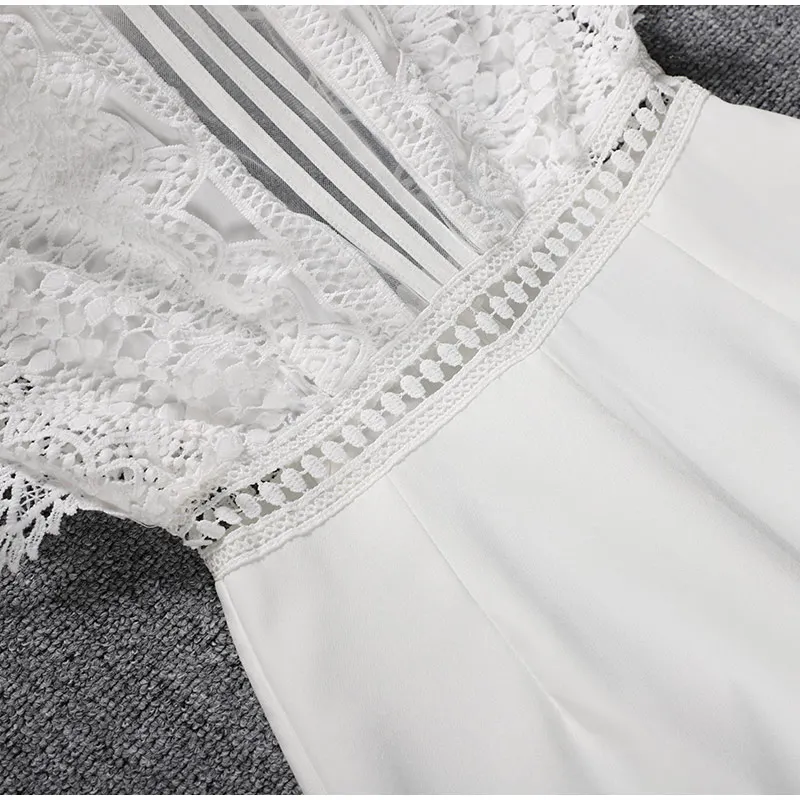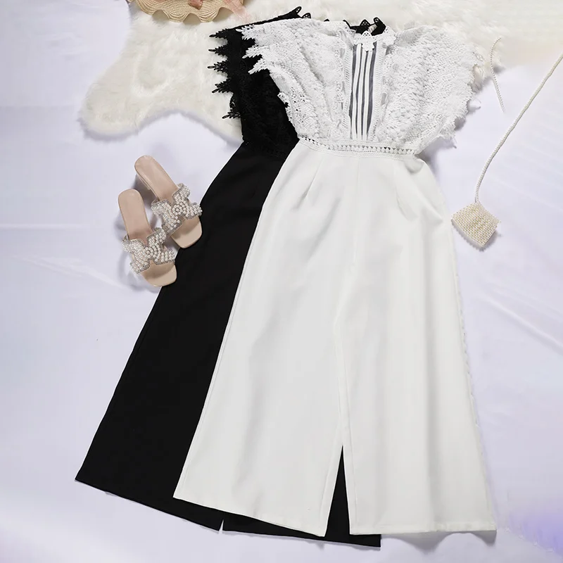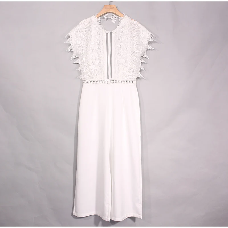 | Sexy Lace Hollow Out Women's Jumpsuit Rompers Sleeveless Backless Black White Overalls 2020 Summer Wide Leg Ruffles Playsuits |